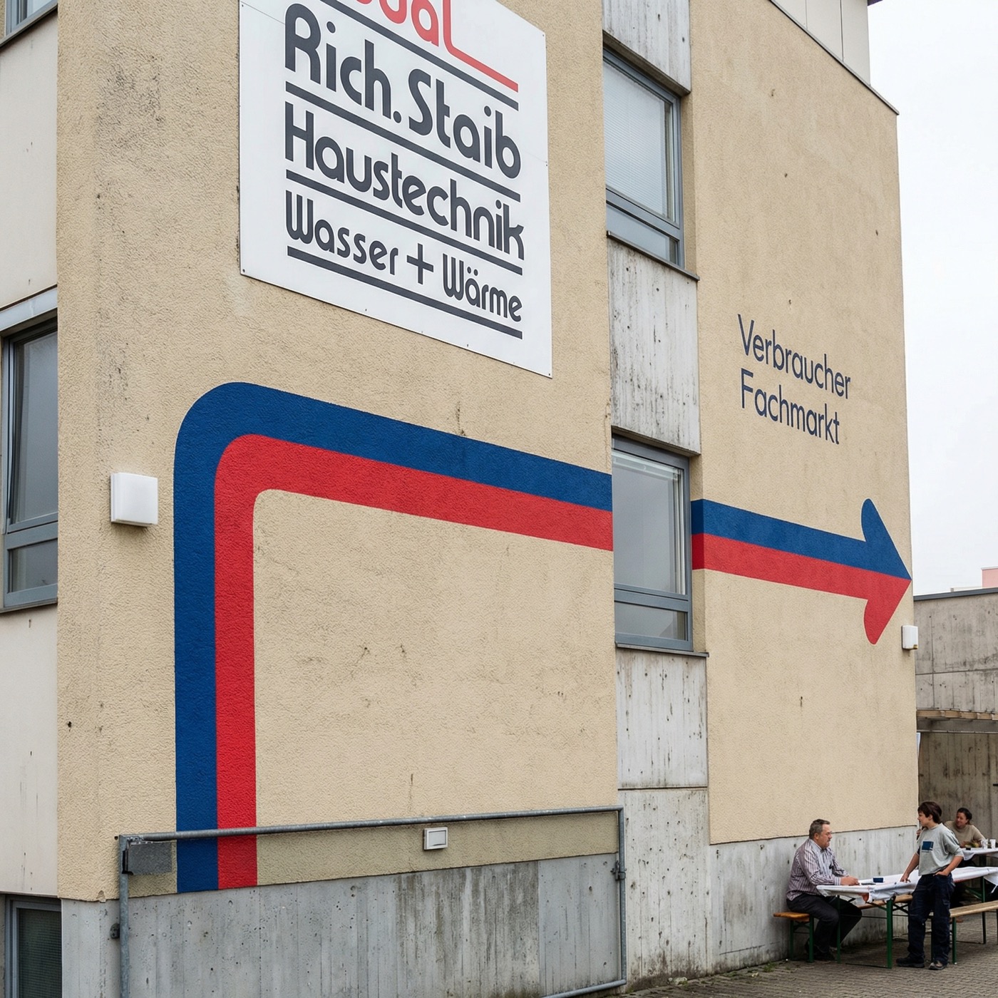 In der Gülichstraße entsteht anstelle der alten Werkstatt ein moderner Verbraucherfachmarkt. „Wasser + Wärme“ – das markante Pfeilmotiv in Blau und Rot wird zum Markenzeichen. STAIB positioniert sich als erste Adresse für Haustechnik in Pforzheim.