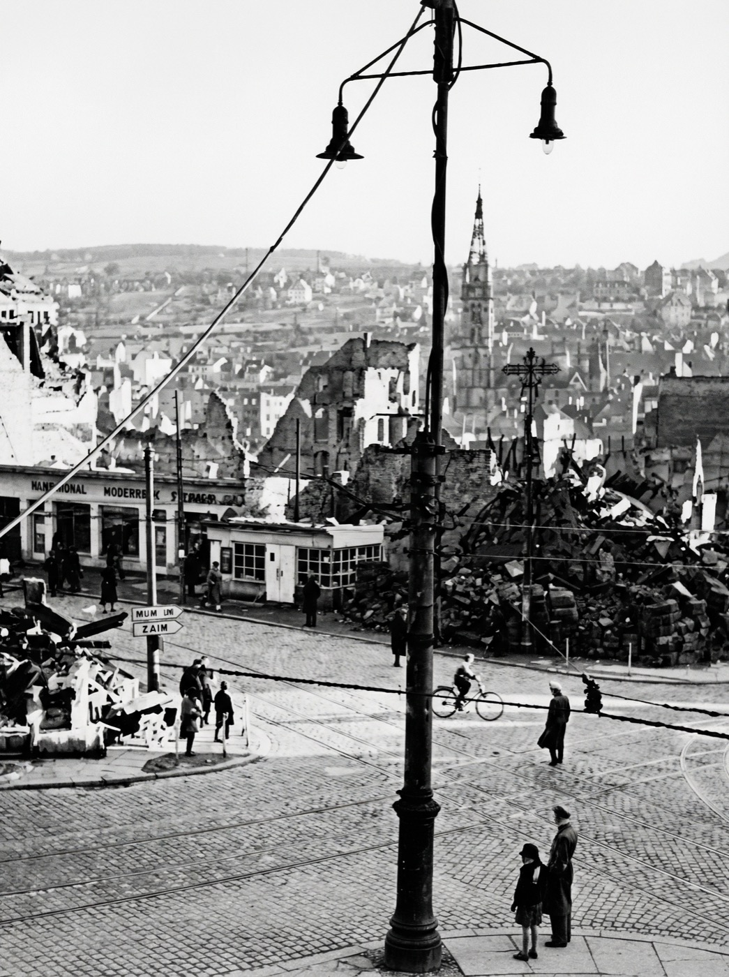 • Sept. 1945Notquartier Büchenbronner Str. 16. Richard Staib auf dem Fahrrad durch die zerstörte Stadt.